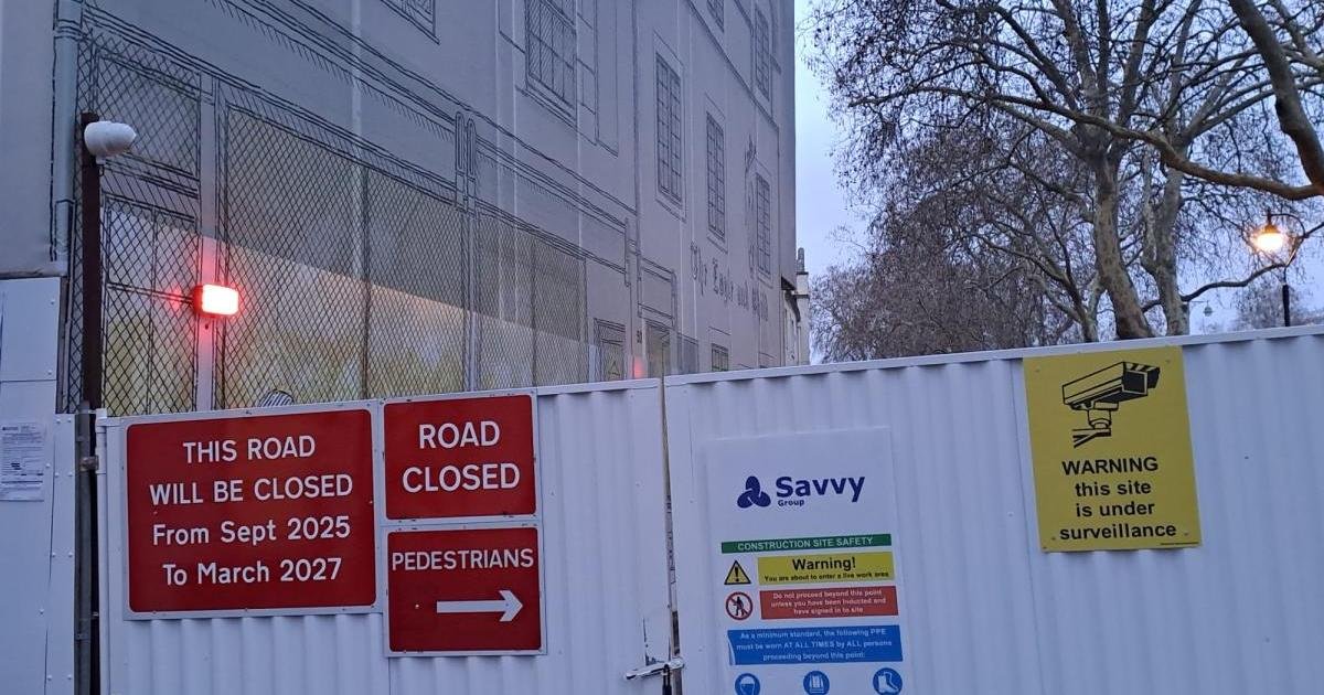 The area at the front of the building has been fenced off, with a sign telling pedestrians the pavement will be shut off “from September 2025 until March 2027”, and scaffolding has been erected.