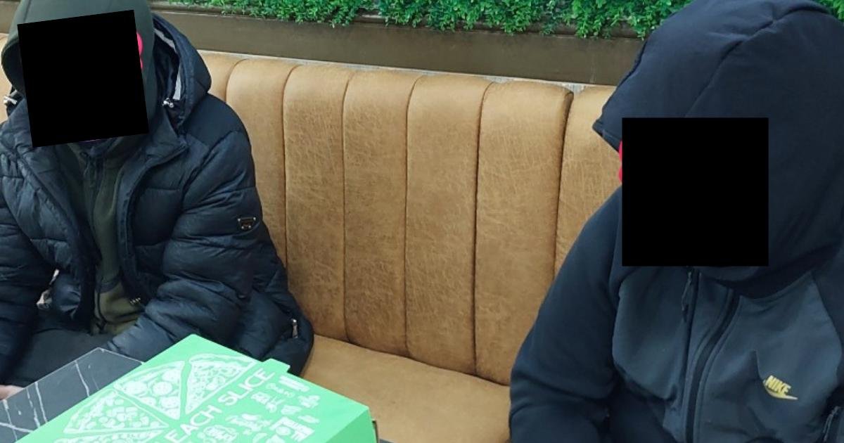 The two kids, dressed in black tracksuits, were sat down in a Banbury pizza shop when they were approached by the officers on Saturday, April 4.