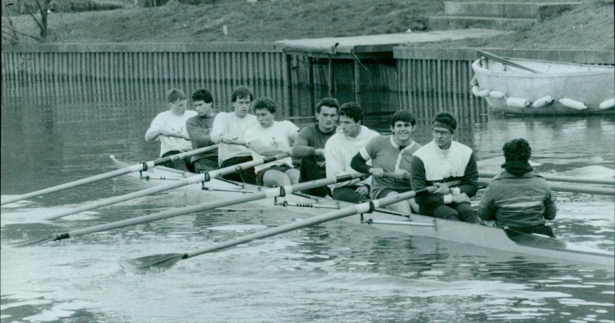 Potential Boat Race candidates looking cheerful as they train on the river, 1977 (Image: Oxford Mail archive)