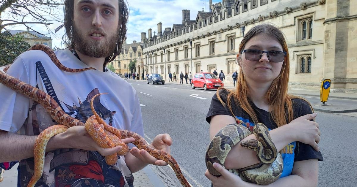 Peter Mills and fiancee Charlie Wren were in Oxford High Street on Saturday with corn snakes Mushu and Felkor, and Royal python Medusa.
